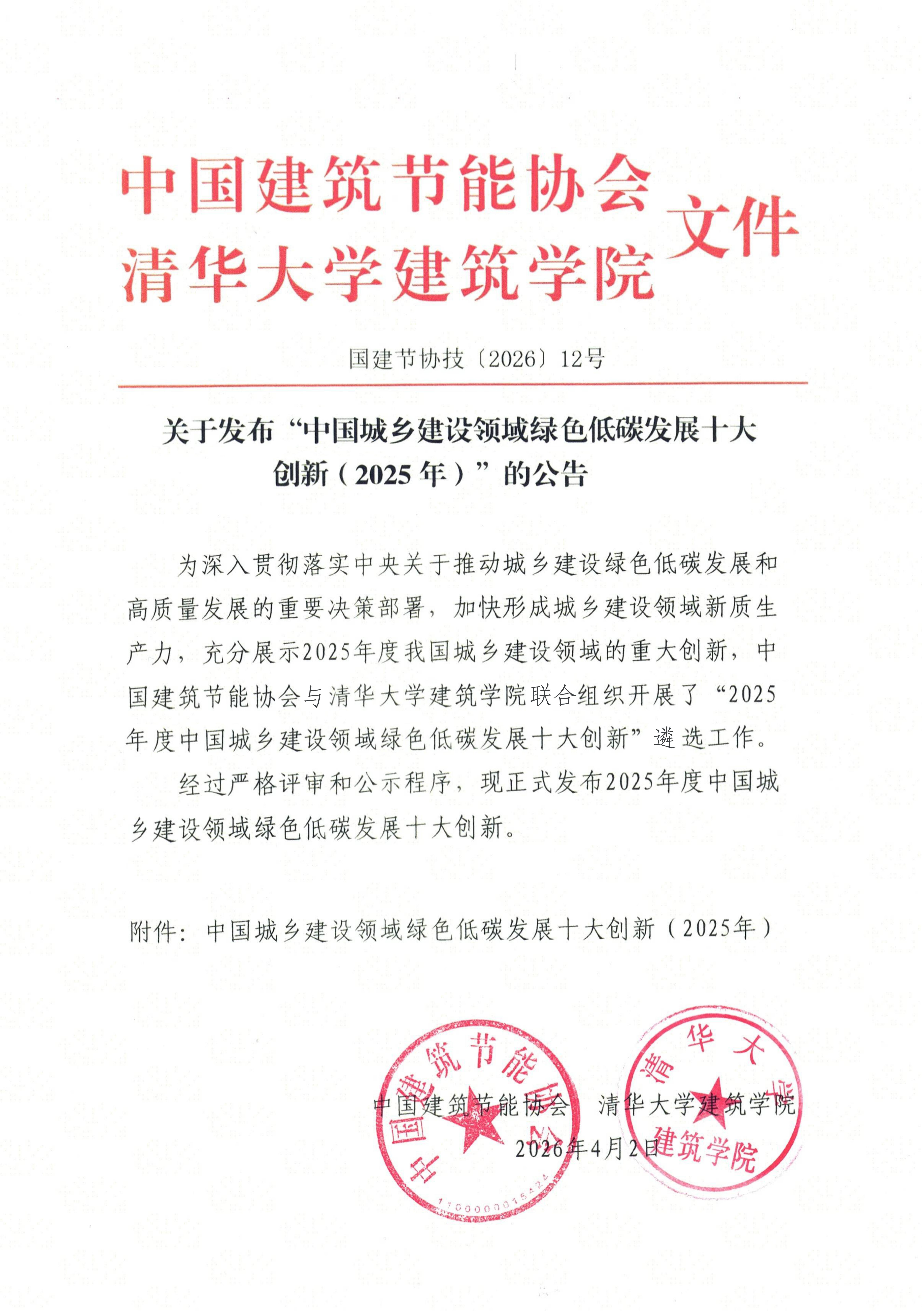 关于发布“中国城乡建设领域绿色低碳发展十大创新(2025年)”的公告