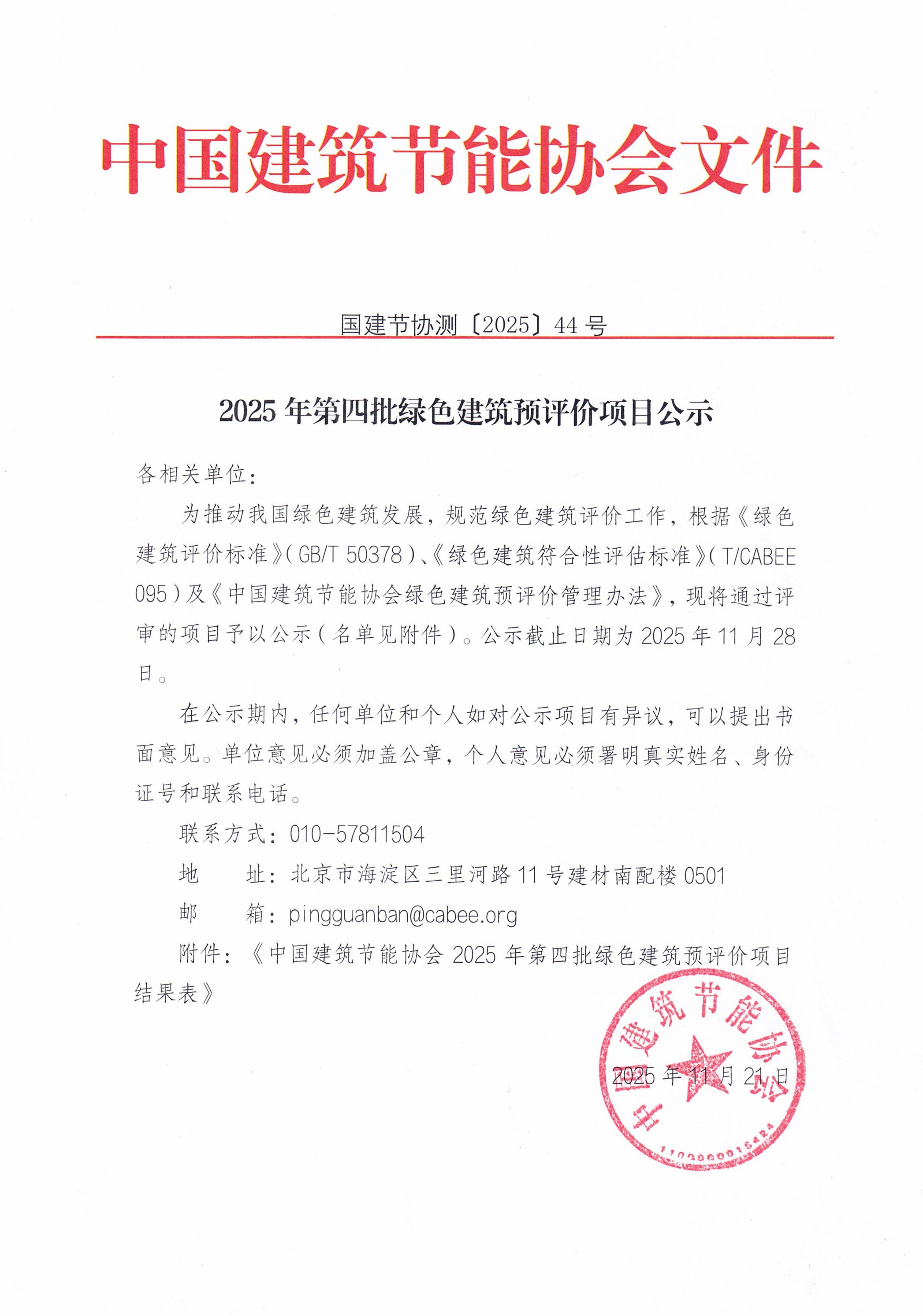为推动我国绿色建筑发展,规范绿色建筑评价工作,根据《绿色建筑评价标准》(GB/T 50378)、《绿色建筑符合性评估标准》(T/CABEE 095)及《中国建筑节能协会绿色建筑预评价管理办法》,现将通过评审的项目予以公示(名单见附件)。公示截止日期为2025年11月28日。